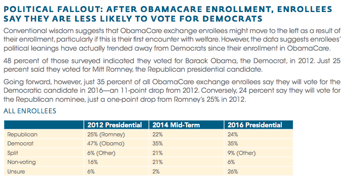One interesting political takeaway from the poll: ObamaCare exchange enrollees are significantly less likely to vote for Democrats in 2016.